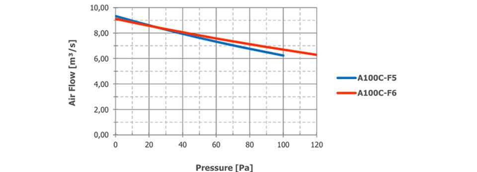 The airflow and sound pressure level (SPL) are given for free blowing operation with inlet and outlet protection grilles. SPL values at 1 meter are measured from the side of the fan. SPL values at 2 meters are calculated using the inverse square law. The declared values may vary depending on the requested options and configurations.