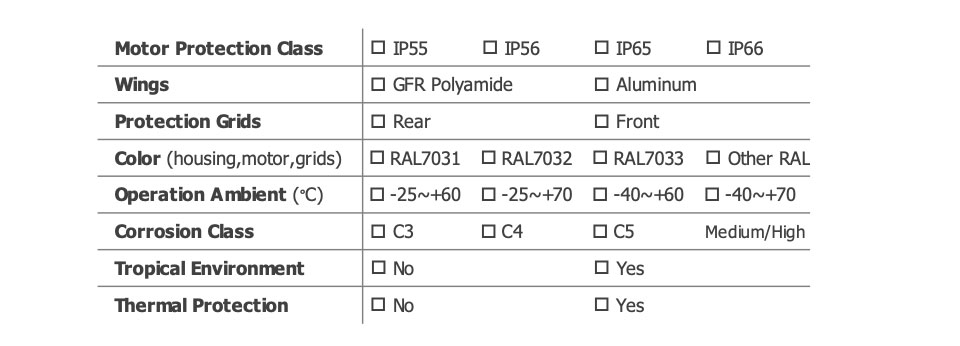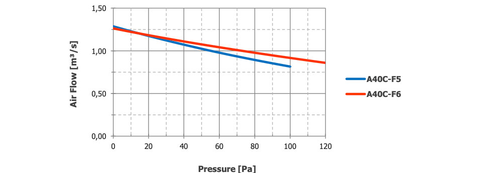 The airflow and sound pressure level (SPL) are given for free blowing operation with inlet and outlet protection grilles. SPL values at 1 meter are measured from the side of the fan. SPL values at 2 meters are calculated using the inverse square law. The declared values may vary depending on the requested options and configurations.