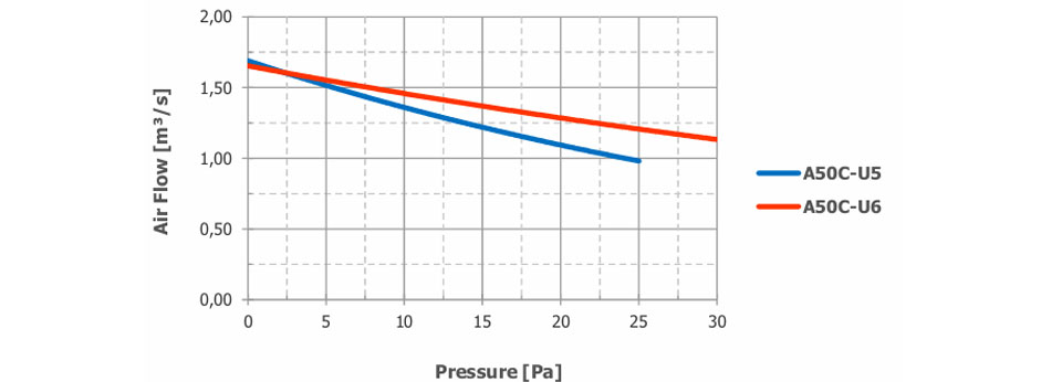 The airflow and sound pressure level (SPL) are given for free blowing operation with inlet and outlet protection grilles. SPL values at 1 meter are measured from the side of the fan. SPL values at 2 meters are calculated using the inverse square law. The declared values may vary depending on the requested options and configurations.