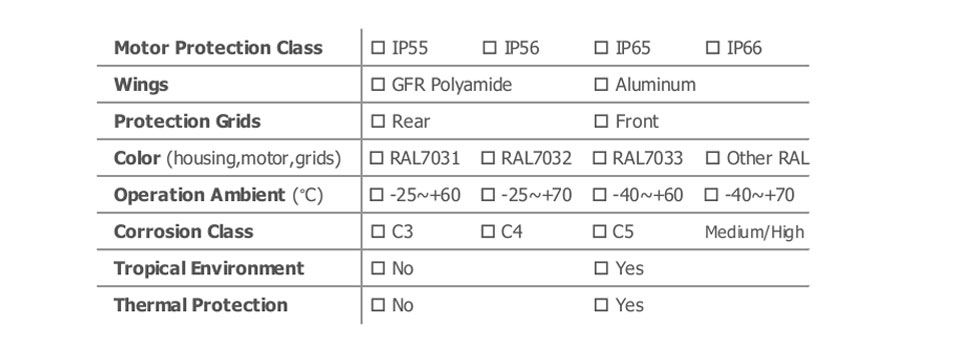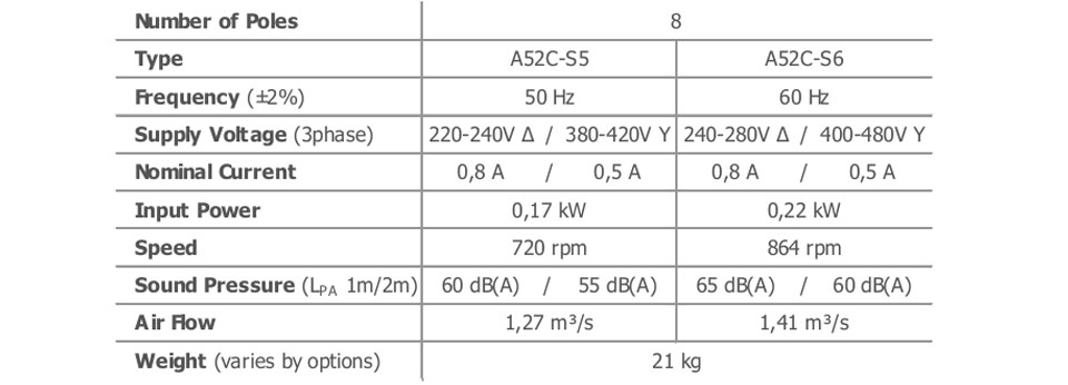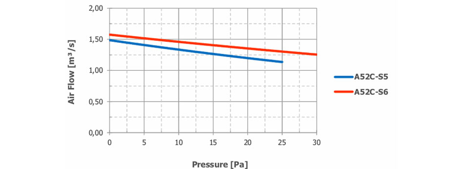 The airflow and sound pressure level (SPL) are given for free blowing operation with inlet and outlet protection grilles. SPL values at 1 meter are measured from the side of the fan. SPL values at 2 meters are calculated using the inverse square law. The declared values may vary depending on the requested options and configurations.