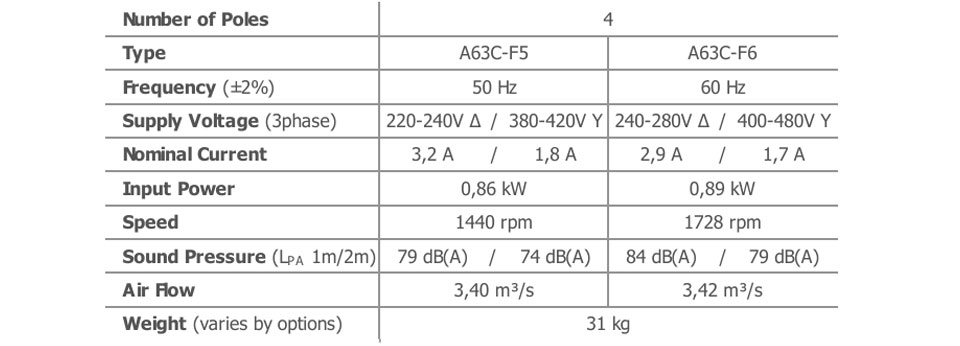 The airflow and sound pressure level (SPL) are given for free blowing operation with inlet and outlet protection grilles. SPL values at 1 meter are measured from the side of the fan. SPL values at 2 meters are calculated using the inverse square law. The declared values may vary depending on the requested options and configurations.