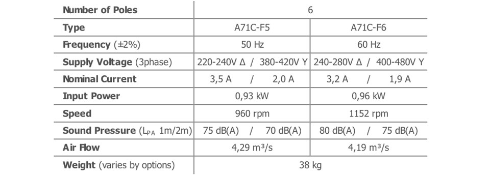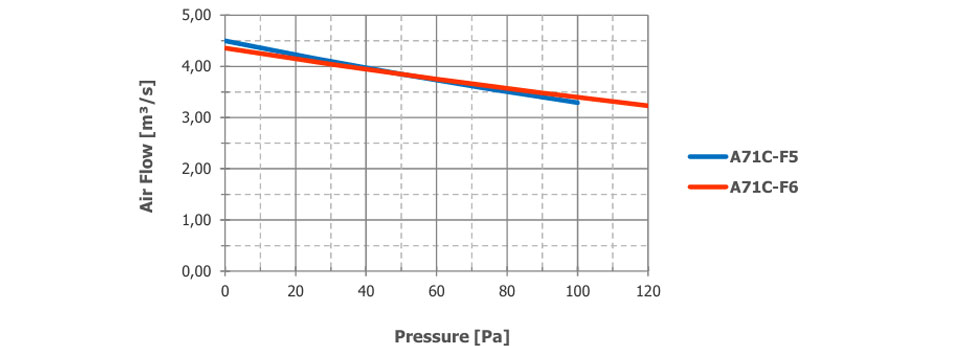 The airflow and sound pressure level (SPL) are given for free blowing operation with inlet and outlet protection grilles. SPL values at 1 meter are measured from the side of the fan. SPL values at 2 meters are calculated using the inverse square law. The declared values may vary depending on the requested options and configurations.