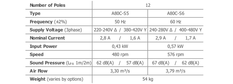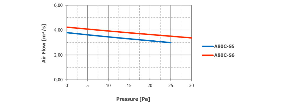 The airflow and sound pressure level (SPL) are given for free blowing operation with inlet and outlet protection grilles. SPL values at 1 meter are measured from the side of the fan. SPL values at 2 meters are calculated using the inverse square law. The declared values may vary depending on the requested options and configurations.
