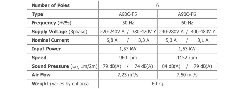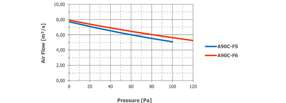 The airflow and sound pressure level (SPL) are given for free blowing operation with inlet and outlet protection grilles. SPL values at 1 meter are measured from the side of the fan. SPL values at 2 meters are calculated using the inverse square law. The declared values may vary depending on the requested options and configurations.